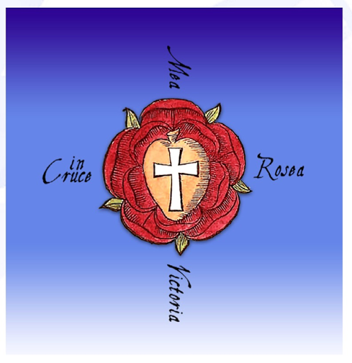 This is telling because it firstly supports the planetary correspondences already discussed; for example, the seventh side, actually on the right of Venus as you enter, is associated with the Sun indicated by the arrow, “all clear and bright.” But secondly we are informed that there is a similar geometrical configuration on the floor as the one we constructed for the ceiling, as you can see. So we have our two “heptagoni, ” one above and one below. It should be noted that the planetary correspondences carry on from the ceiling to the floor…At this point the author refers to a so called “ungodly” element in the invisible form of “inferior Governors” existing in the floor section of the Vault. These are the destructive forces of our inner self, all that belongs in the physical world and which are in opposition to those traditional angelic associations in the upper part mentioned earlier. This aspect of opposition in the Vault is an illustration of our Rosicrucian path which involves moving through the three main alchemical stages. This is our work of spiritual alchemy, transforming and refining our soul personality.The image of the victorious rose cross, the ultimate symbol of spiritual attainment, from the Secret Symbols of the Rosicrucians. At its centre is a cross surrounded by a heart, the traditional symbol of love. Surrounding the heart and cross is the mystical rose itself representing the soul personality; no longer depicted at the centre of the cross but shown enveloping the whole, symbolising the victory over the material part of our existence. In Cr u c e R o s e a Me a Victoria: In the Rose Cross I am Victorious.