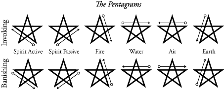 In order to understand why the LBRP’s pentagrams are traced clockwise, you have to gain some understanding of the larger Adept-level Pentagram Ritual within the Golden Dawn tradition. The four elements crowned by Spirit are arrayed around the figure of the Pentagram as follows: